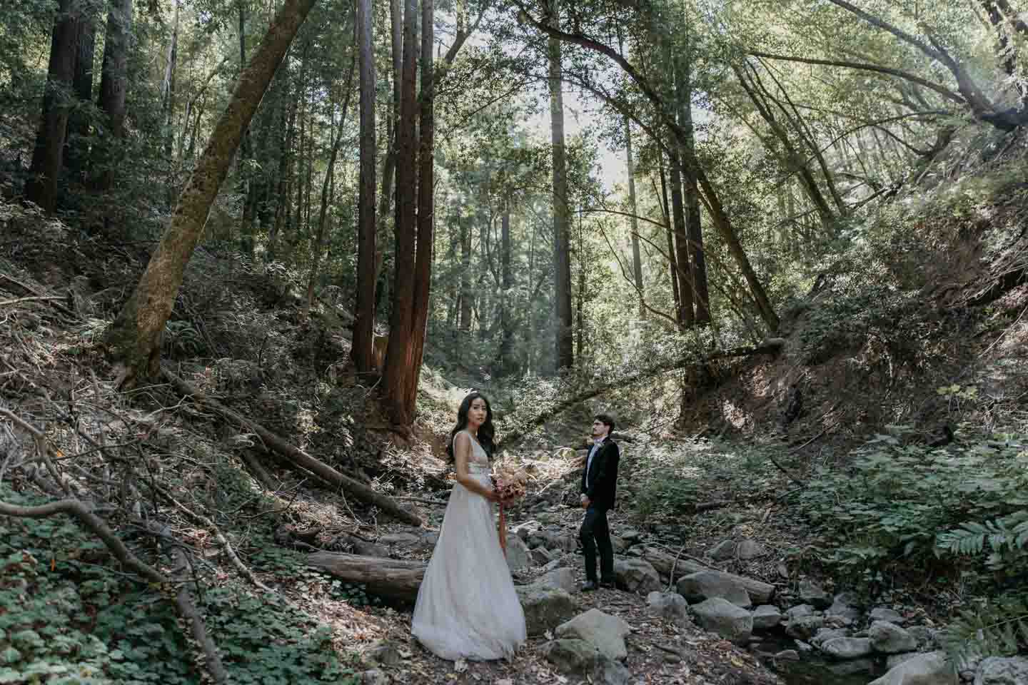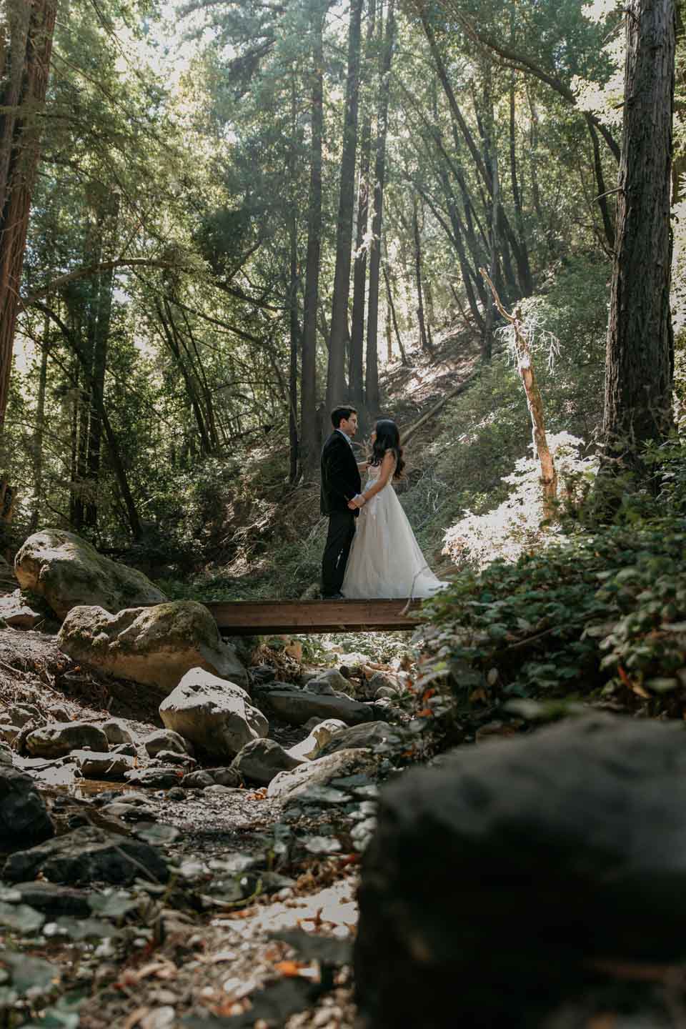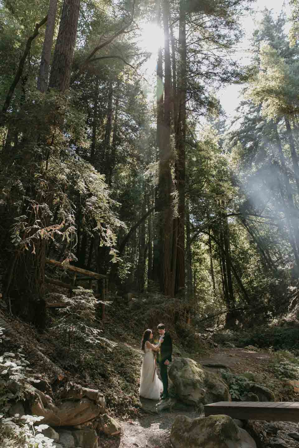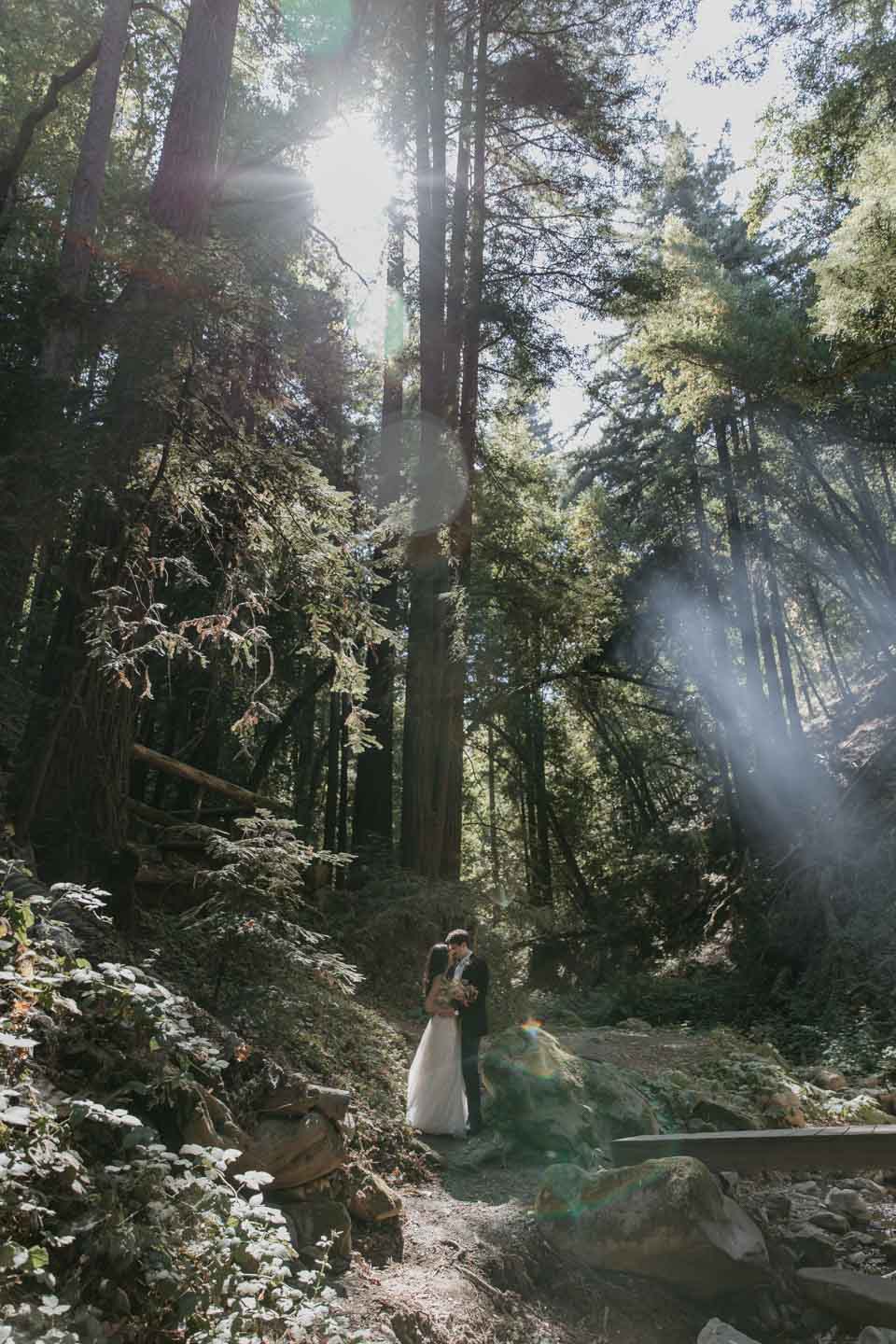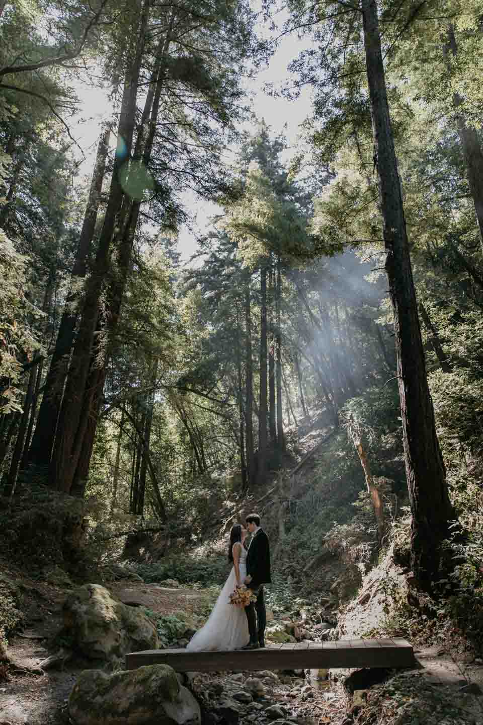 A Saratoga Springs wedding features the Santa Cruz Mountains, towering Redwoods, and flowing creeks. The outdoor wedding of your dreams. Listen to the birds chirp, the trees rustle, and Olivia and Bobby vow their love.